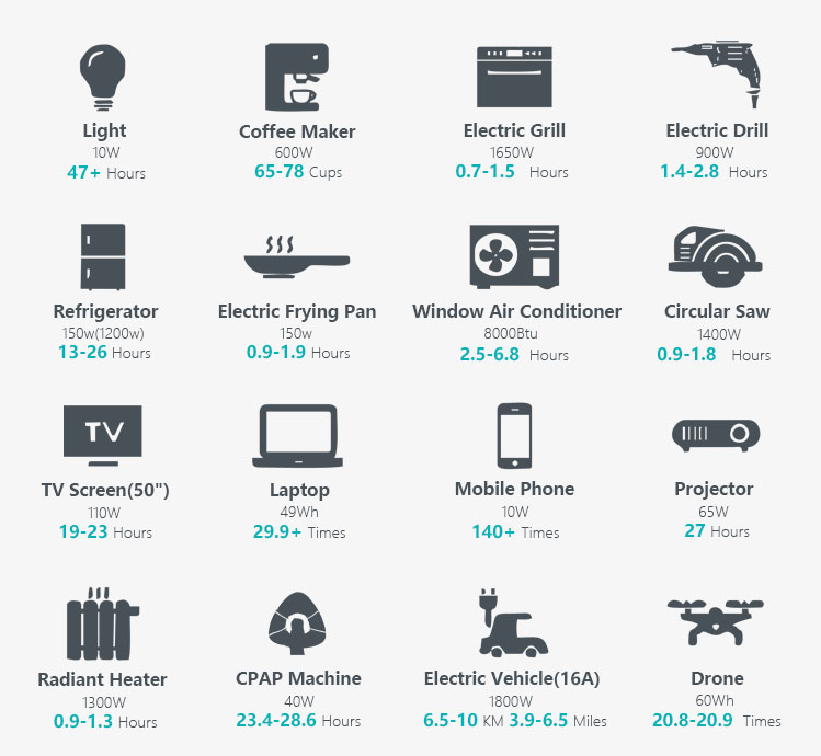 It can support any electric appliance which under 2000w, such as regrigerator, grill, air conditioner, TV, laptop, electric vehicle, light and so on.